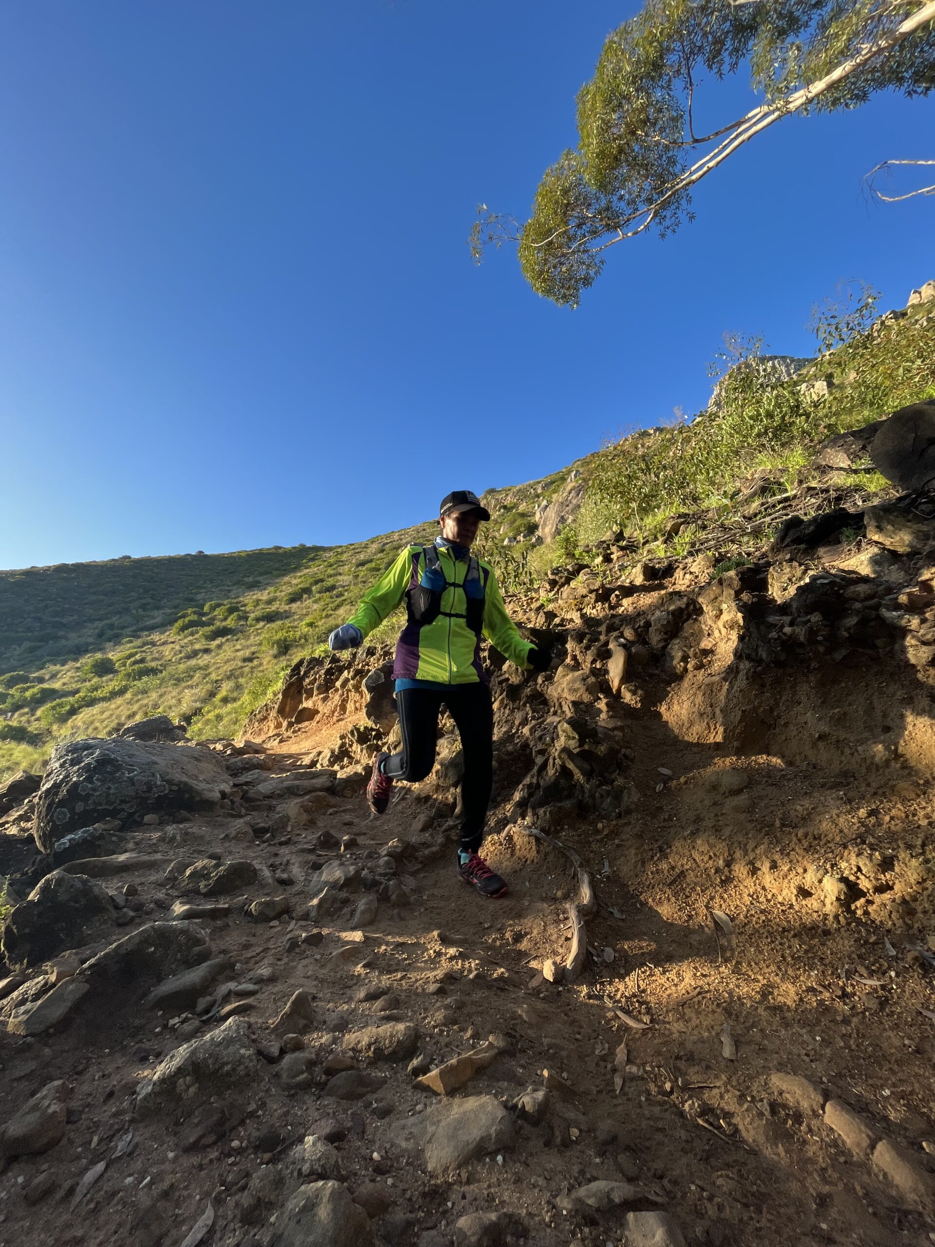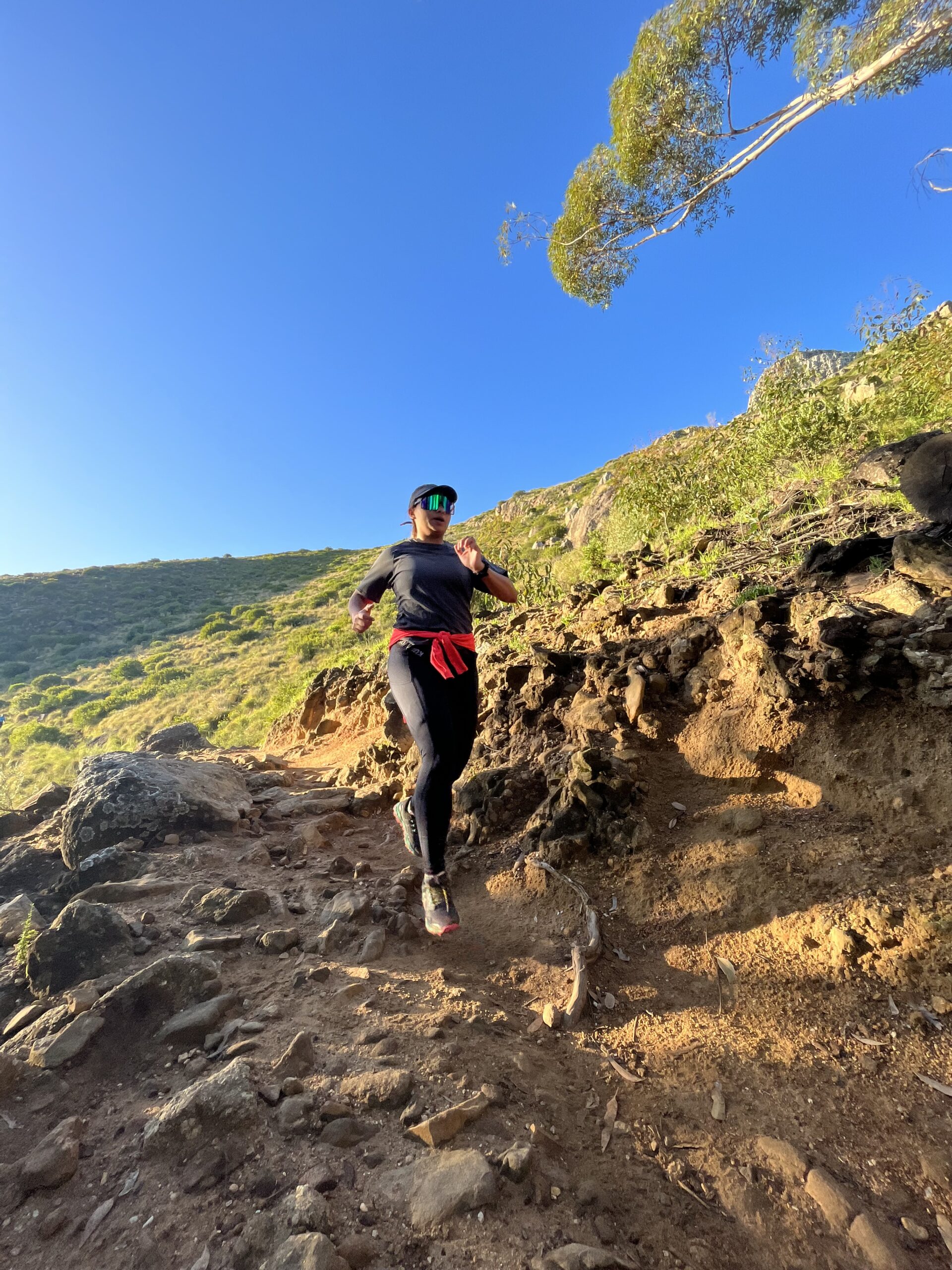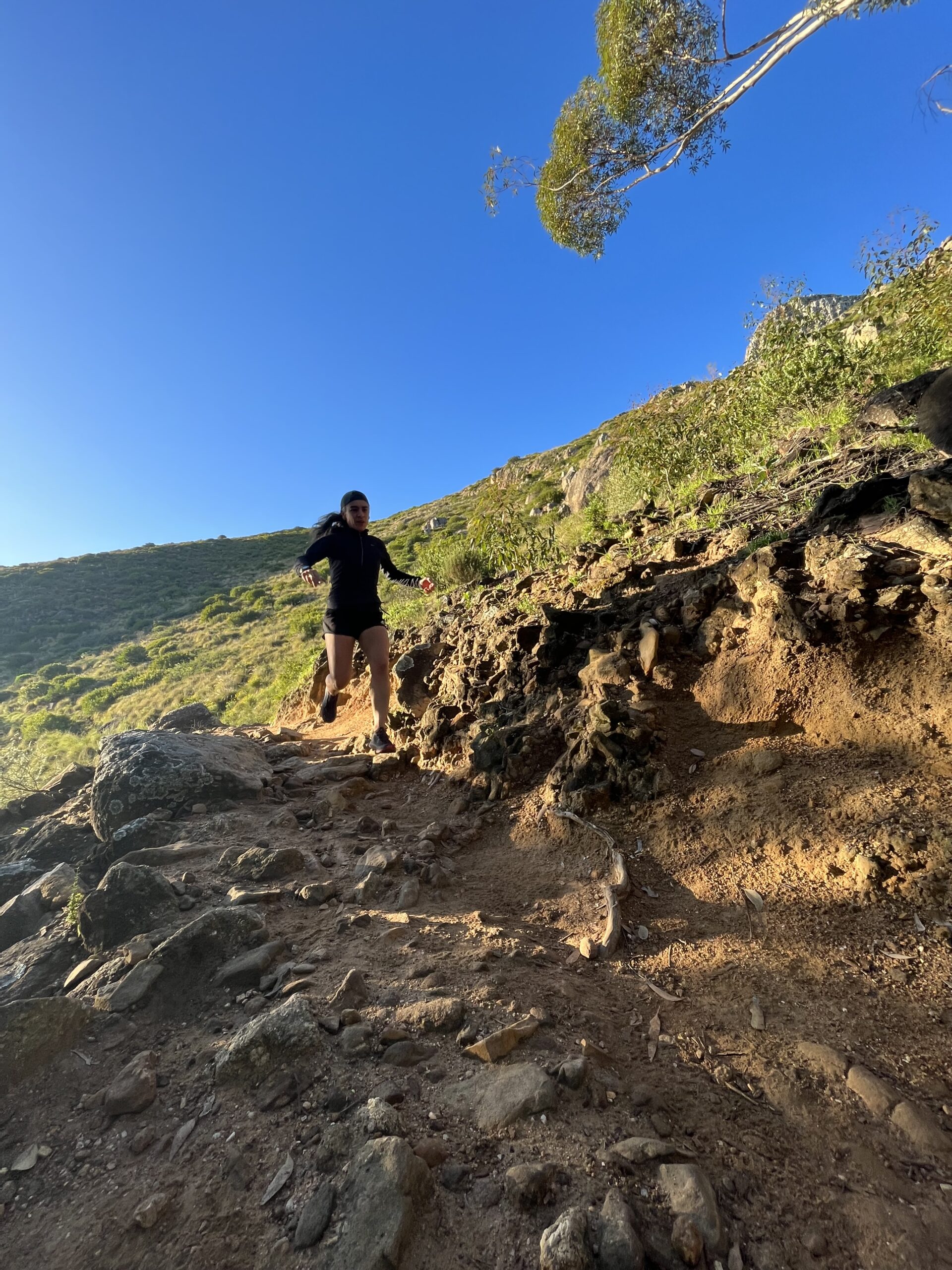 Being light on your feet and having a quick turnover/cadence while running downhill will help reduce your ground contact time and help you stay nimble. This will help you reduce the landing force going through your body and put less pressure on your joints and muscles. In addition to that if you take quick steps even if you hit something you weren’t expecting, you have already transitioned to the other foot and have enough time to react and stay upright and stable.